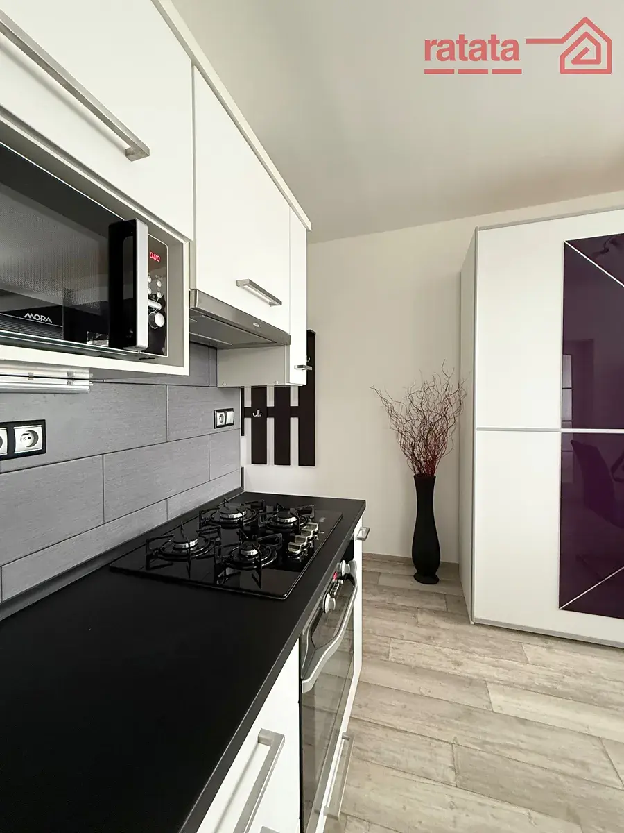 Je zde kuchyňská linka, plynová deska, vestavěná trouba, sprchový kout, umyvadlo a WC. Na podlahách je položena plovoucí podlaha a dlažba. Byt je volný k nastěhování IHNED.