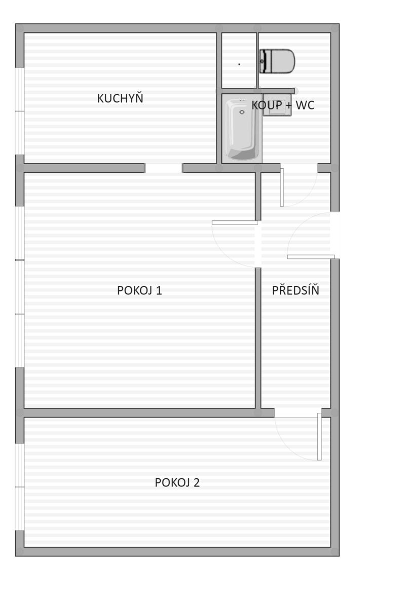 Dispozice bytu zahrnuje centrální obývací pokoj s přístupem do prostorné kuchyně, samostatnou neprůchozí ložnici a předsíň. K bytu náleží sklepní kóje. Byt je momentálně volný, připraven k okamžitému bydlení nebo k pronájmu.