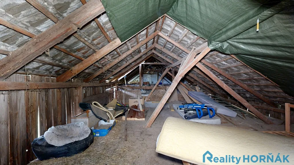 V současné době dům nabízí dispozici 5+KK, rozloženou do přízemí a obytného podkroví. V přízemí jsou situovány místnosti obývacího pokoje s kuchyňským koutem (6,40 x 5,03 = 32,2 m²), ložnice (5,05 x 4,37 = 22,1 m²), pokoj (3,56 x 3,74 = 13,3 m²), koupelna (2,37 x 2,07 = 4,9 m²), samostatné WC (1,52 x 1,52 = 2,3 m²). Dispozici přízemí doplňují místnosti vstupní chodby (3,74 x 2,55 = cca 9,5 m²), navazující komunikační část chodby (3,69 x 1,42 = cca 5,2 m²) a komora (1,33 x 1,44 = 1,9 m²). Po pohodlném schodišti vystoupáme do podkroví se komunikační chodbičkou (3,69 x 2,42 = cca 8,9 m²) a dvěma pokoji (3,69 x 4,63 = 17,1 m² a 3,69 x 4,54 = 16,8 m²). V mezipatře je vybudováno samostatné WC (1,42 x 1,46 = cca 2,1 m²). Dispozici podkroví lze případně dále rozvíjet do dosud nevyužitého půdního prostoru (3,69 x 6,74 = cca 24,9 m²). Rodinný dům dále nabízí dvě sklepní místnosti (8,30 x 1,54 = 15,4 m² a 2,30 x 5,12 = 12,6 m²). Potravinový sklep je přístupný z chodby, technický sklep ze dvora. Uvedené výměry místností vycházejí z dostupných půdorysných podkladů a z měření v rámci 3D skenu nemovitosti. Jedná se o orientační údaje sloužící pro základní přehled o dispozici; přesné výměry se mohou v drobných odchylkách lišit. Obvodovou konstrukci domu tvoří smíšené, převážně cihelné zdivo. Okenní otvory jsou osazeny plastovými okny s izolačním dvojsklem. Fasáda není zateplena. Dům kryje nová střešní krytina, položená na původním krovu. Obytné místnosti podkroví jsou zatepleny skelnou vatou. V přízemí jsou převážně betonové podlahy, kryté linem, v části jsou původní dřevěné podlahy překryté OSB deskami a opět linem. V podkroví jsou betonové podlahy, kryté linem, anebo keramickou dlažbou. V rámci modernizace domu byly provedeny nové rozvody elektřiny (měděné vodiče). Rozvody vody a odpadů jsou nové, provedené v plastu. Vodou je dům zásobován z vlastní kopané studny o hloubce cca 8–9 m. Odpady jsou svedeny do septiku s následným trativodem do pole. Vytápění je řešeno teplovodním ústředním systémem (radiátory) napojeným na tepelné čerpadlo vzduch–voda. Ohřev teplé vody zajišťuje elektrický bojler.