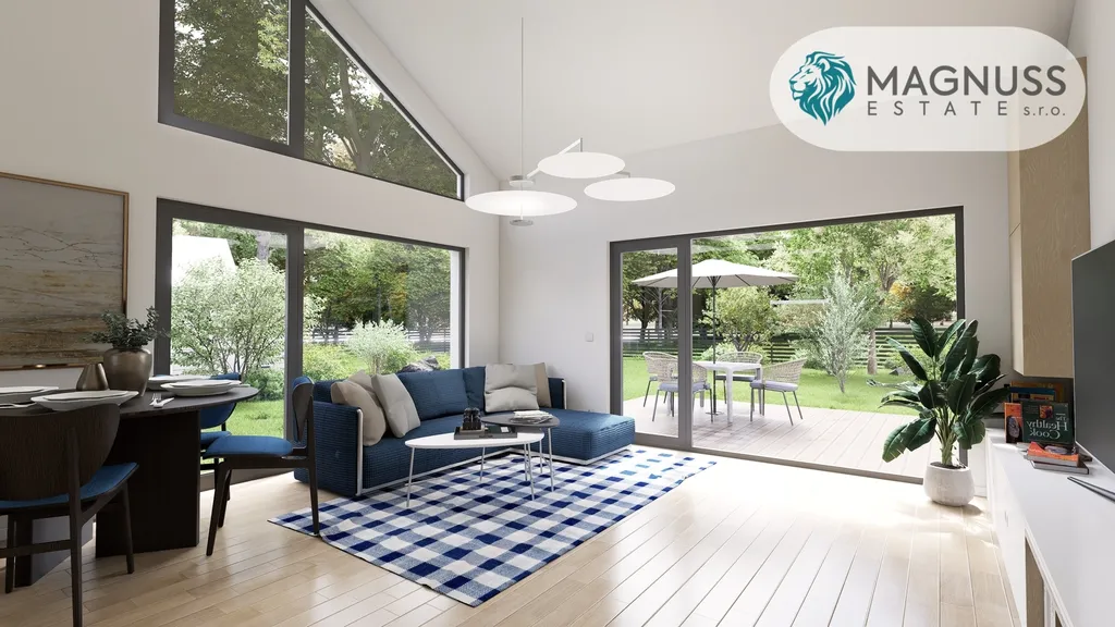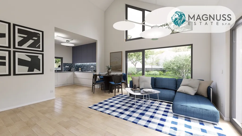 Interiér je navržen s důrazem na vzdušnost, světlo a přirozené propojení prostoru. Velkoformátová okna spolu s otevřenou obytnou zónou propojují interiér se zahradou a terasou, čímž vzniká harmonické prostředí pro každodenní život i společenské chvíle. Otevřený strop podtrhuje pocit prostoru a architektonické čistoty.