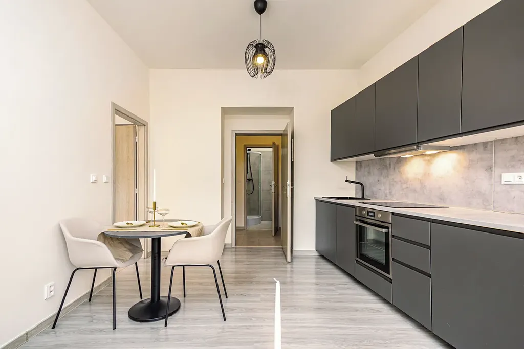 Po vstupu do bytu Vás přivítá prostorná chodba, ze které je vstup do koupelny se sprchovým koutem, toaletou a pračkou se sušičkou. Následuje obývací prostor s kuchyňským koutem, kde je moderní kuchyňská linka vybavená všemi spotřebiči, lednicí s mrazákem, myčkou, troubou, indukční varnou deskou a dalším vybavením.
