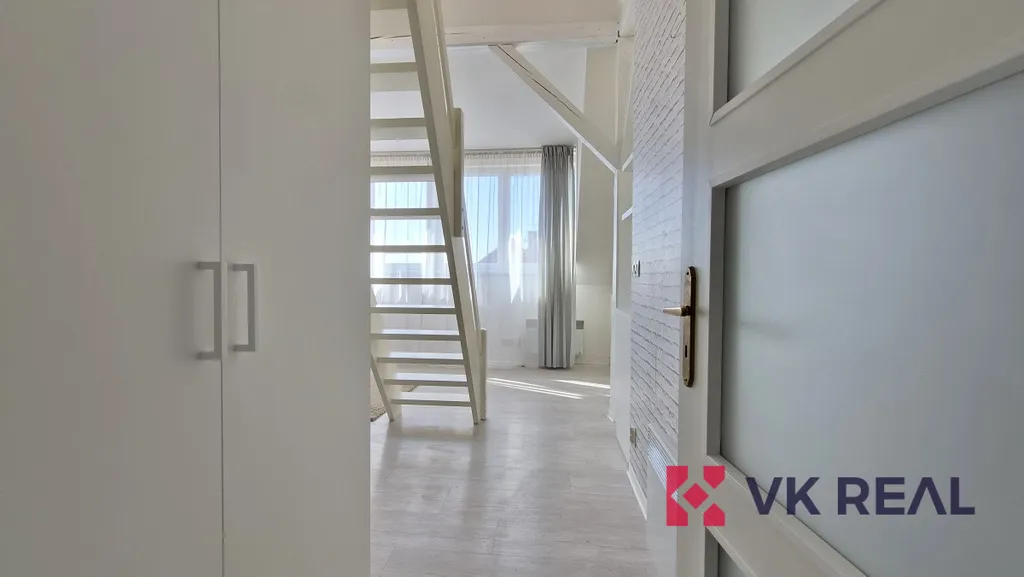 Byt se nachází ve třetím podlaží vily bez výtahu. Jedná se o loft zaujímající dispozici 1+kk a obytnou plochu cca 50m2 a pronajímá se zařízený dle fotografií. Dispozice je rozdělena následovně: ve spodním patře se nachází předsíň, koupelna se sprchou a WC a obývací pokoj s kuchyňskou linkou. Horní část bytu tvoří patro pro spaní. Kuchyňská linka je plně vybavena spotřebiči značky Elektrolux, v úložných vestavěných prostorách v předsíni je umístěna pračka, též značky Elektrolux. Vytápění je řešeno elektrickými přímotopy, ohřev teplé vody elektrickým bojlerem.