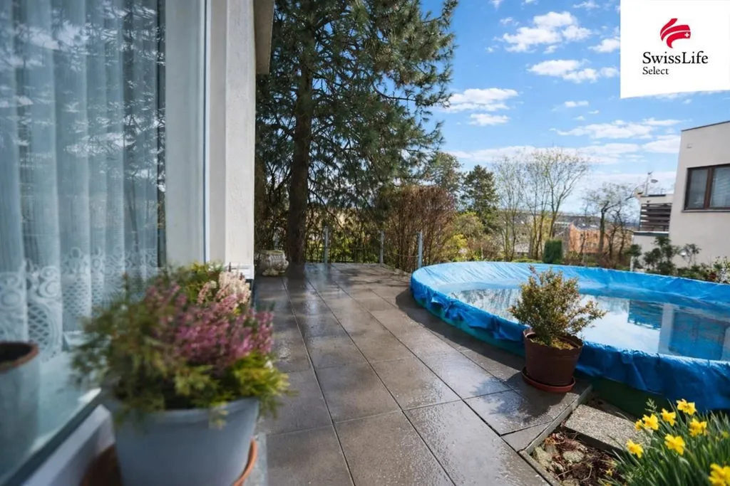 Z obývacího pokoje je vstup na velkou terasu s krásným výhledem na Dobrou Vodu, která nabízí příjemné posezení, dostatek soukromí a přímý vstup na zahradu.