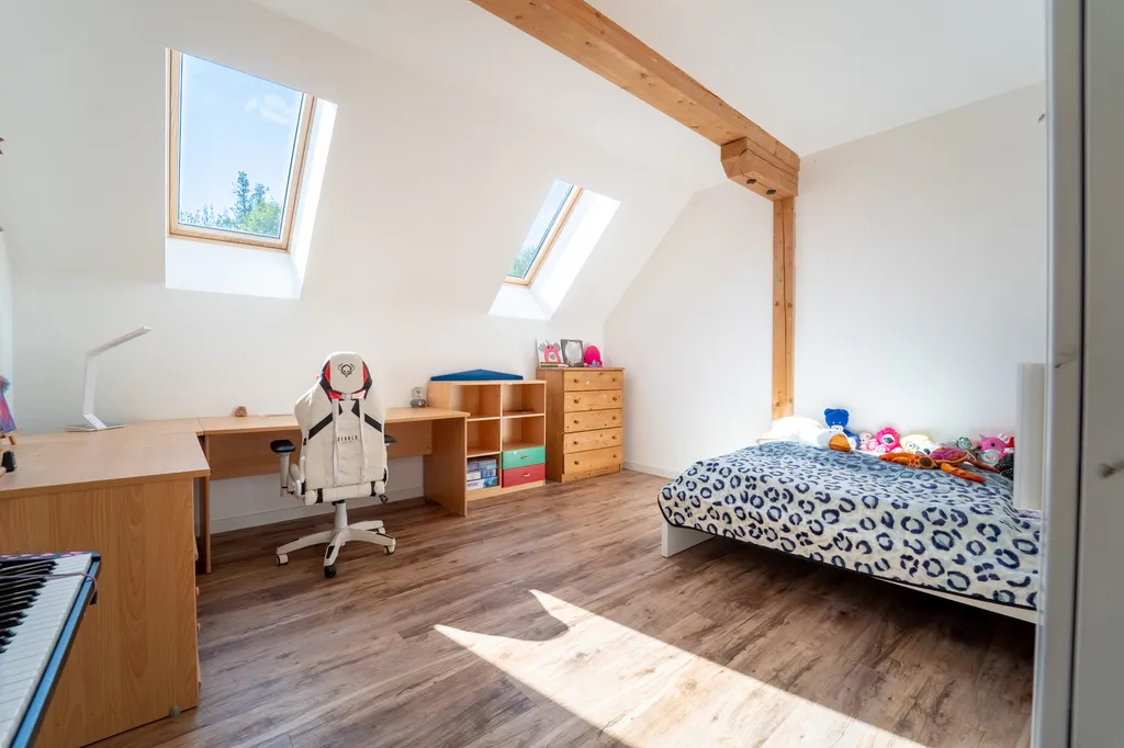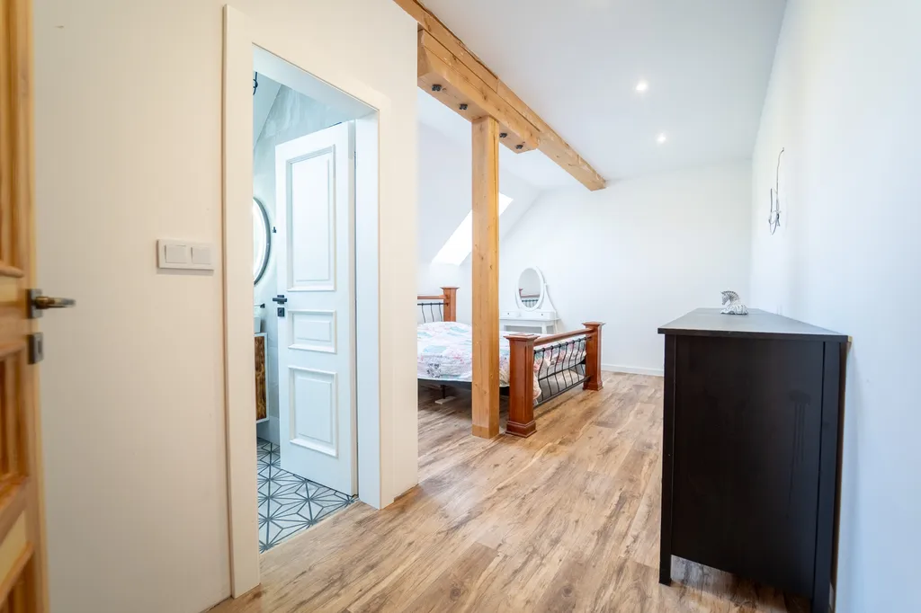 • V 1. patře se nachází prostorný moderní byt s podlahovým vytápěním, dispozicí 6+KK o výměře 200 m² se dvěma koupelnami.