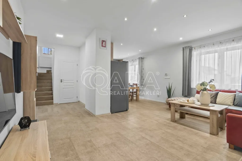 První nadzemní podlaží tvoří předsíň se šatnou (10 m2), prostorný obývací pokoj s kuchyňským koutem (cca 41 m2), koupelna s vanou (3 m2) a samostatná toaleta (1,3 m2). Moderní kuchyňská linka je vybavena vestavnými spotřebiči.