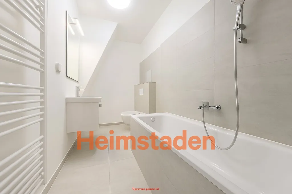 Koupelna je řešena velmi vkusně – s vanou, toaletou a moderním designem, který působí čistě a nadčasově. Samozřejmostí je také prakticky vyřešený prostor pro pračka i sušičku, které lze pohodlně umístit do předsíňky vedoucí do koupelny.