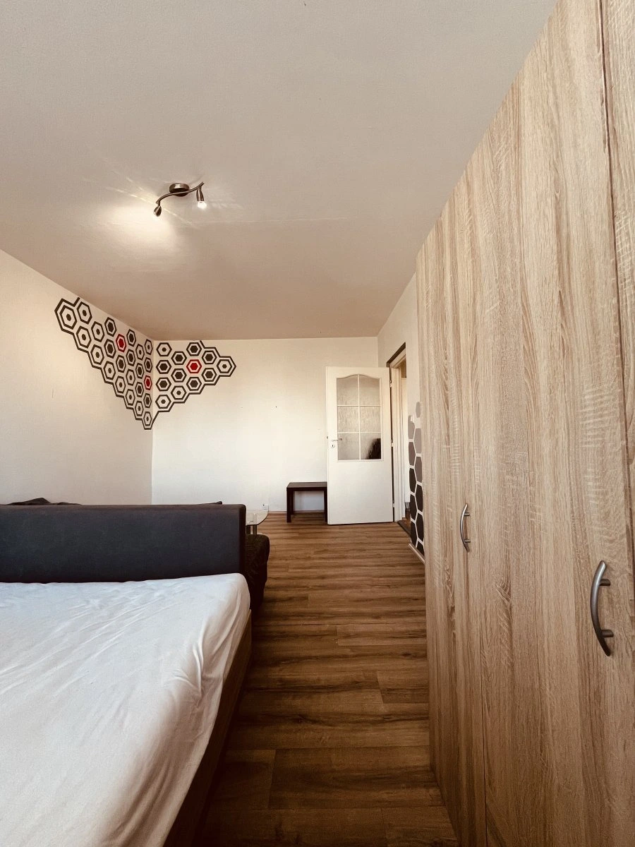 V pokoji najdeme skříň, postel s rošty a matrací, gaučem a stolkem.