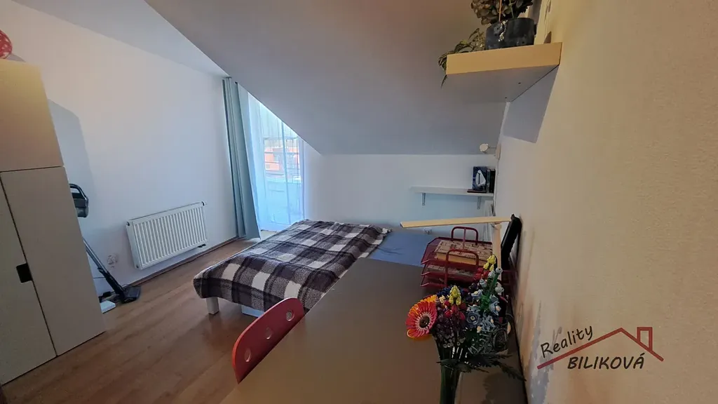 Dispozice bytu: předsíň (2,6m2) , obývací pokoj s kuchyňským koutem (17,5m2), WC s umyvadlem (2,8m2), v pokoji vstup do patra kde se nachází předsíň, 2 pokoje ( 8,2m2 a 12,3m2), koupelna ( 2,4m2). Z obývacího pokoje vstup na balkon, z jednoho z pokojů vstup na terasu.