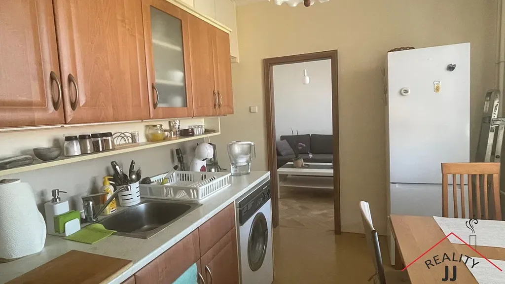 Byt je v původním udržovaném stavu, odpovídajícímu stáří, s původním el. vedením, parketami,koupelnou s vanou, Nachází se ve 4.NP-na 3.patře. Po vstupu do bytu máme malou předsíň s věstavěnou skříní ,botníkem a zrcadlem. Z ní jsou vstupy do většiny pokojů. První místnost vpravo je toaleta a vedle ní koupelnou hned vedle. Dále máme vstup do kuchyně, která je sice menší (11 m2), ale má všechny potřebné spotřebiče a spoustu odkládacích ploch.Je zde nova lednice, mikrovlnná trouba ,sporák a pračka. Obývací pokoj je prostorný (26 m2) ,s francouzským oknem,se 2 vchody, jedním do předsíně a jedním do ložnice. Ložnice je rovněž prostorná (12 m2) a lze ji v případě zájmu prohodit s obývacím pokojem. Celý byt je velmi světlý se spoustou oken, je částečně vybaven nábytkem.