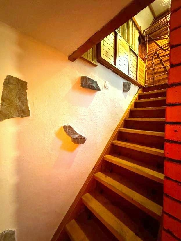 Uvnitř najdete kuchyni s cihlovými kamny a posezením, obývací pokoj a další tři pokoje pro spaní či zázemí pro děti a hosty. Nechybí koupelna se sprchou, samostatné WC ani praktické technické zázemí.