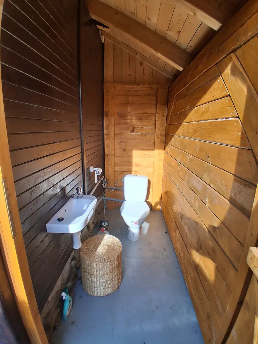 K chatě je pak přistavěna zastřešená přístavba, kde je krb a posezení v případě špatného počasí.
