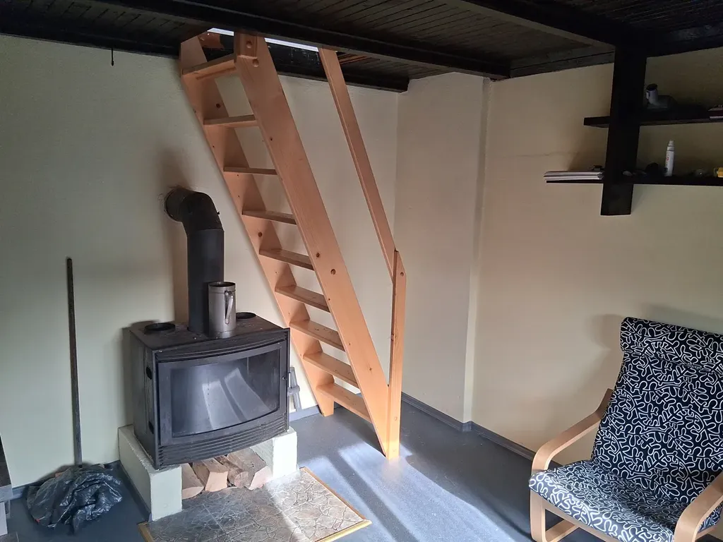 Uvnitř chaty je pokoj s kuchyňskou linkou, krbovými kamny a také s menším sklepem. Z pokoje vedou schody do podkroví.