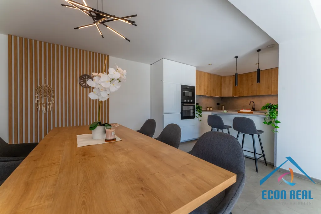Interiér včetně kvalitní kuchyně je laděn do světlých a teplých tónů a vyznačuje se praktičností a zároveň nadčasovým a moderním designem a velká okna v obou podlažích Vám zajistí naprostý pocit propojení s přírodou.