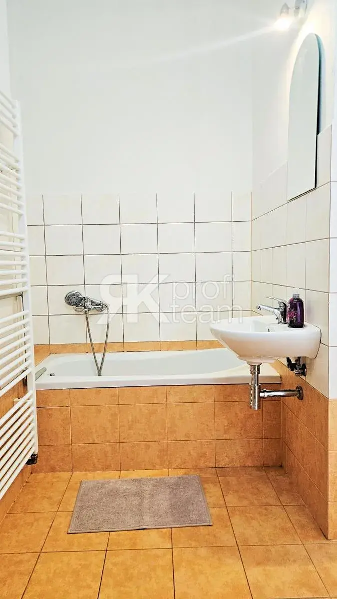 Jednotka prošla před časem kompletní rekonstrukcí a je připravena k okamžitému nastěhování. Dominantou je prostorná kuchyně s velkou kuchyňskou linkou včetně osvětlení a spotřebičů (trouba, varná deska, digestoř, myčka, lednice s mrazákem). Koupelna s vanou, umyvadlem a pračkou je prakticky spojena s toaletou. Nechybí velký obývací pokoj a vstupní předsíň.