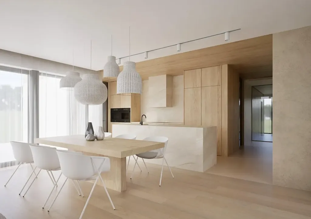 Dominantou přízemí je velkorysý obytný prostor o výměře 109 m², který v sobě harmonicky propojuje obývací část, jídelnu a kuchyň. Velkoformátová okna přivádějí do interiéru maximum denního světla a přirozeně propojují vnitřní prostor se zahradou, čímž umocňují pocit otevřenosti a kontinuity.