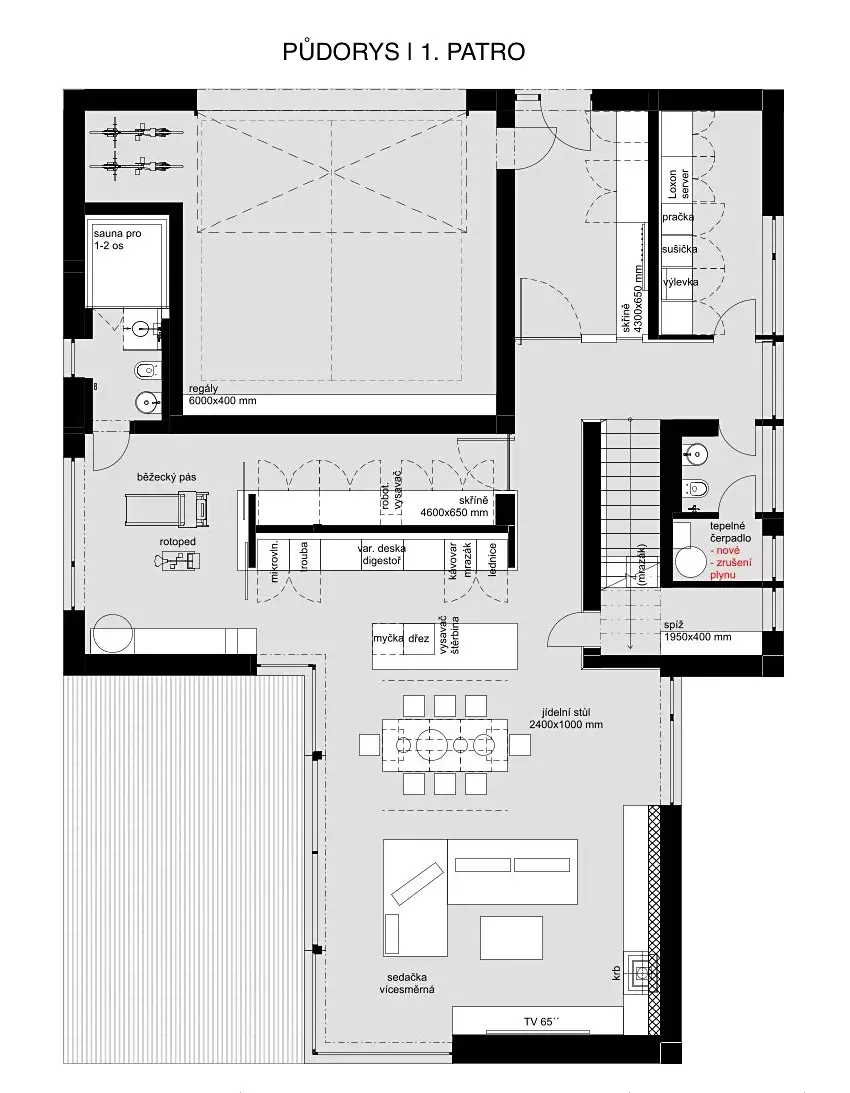 Na obytnou část navazuje privátní wellness a fitness zóna se saunou, navržená jako klidové místo pro regeneraci a každodenní rovnováhu.