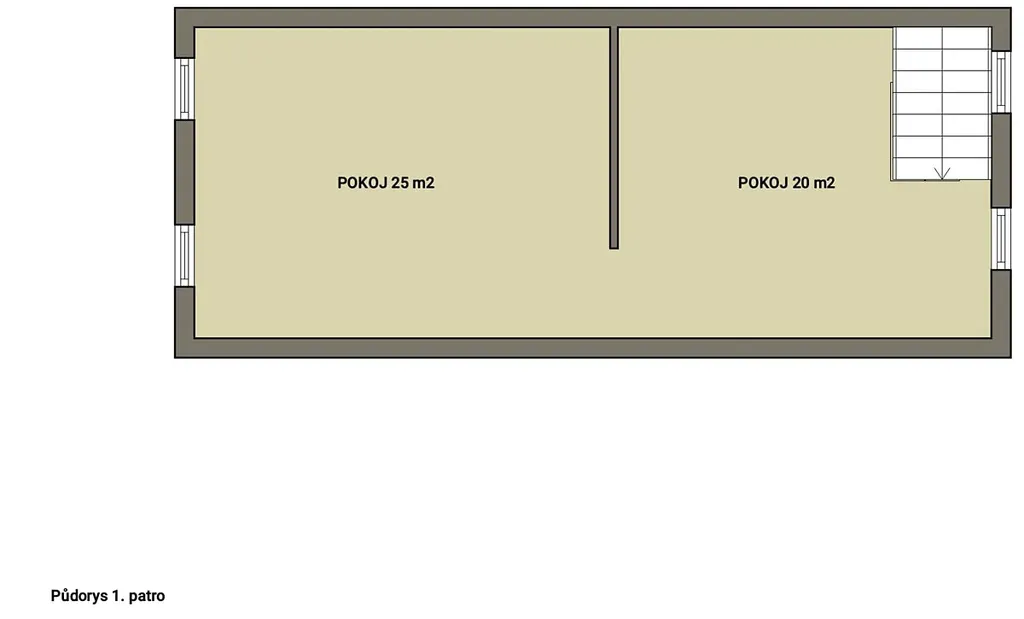 V přízemí se nachází útulná kuchyně, která přirozeně navazuje na světlý obývací pokoj s dominantními kachlovými kamny – srdcem celého domu, vytvářejícím neopakovatelnou atmosféru tepla a domova. Dále je zde koupelna, vstupní veranda a praktický dřevník s navazující kůlnou.
