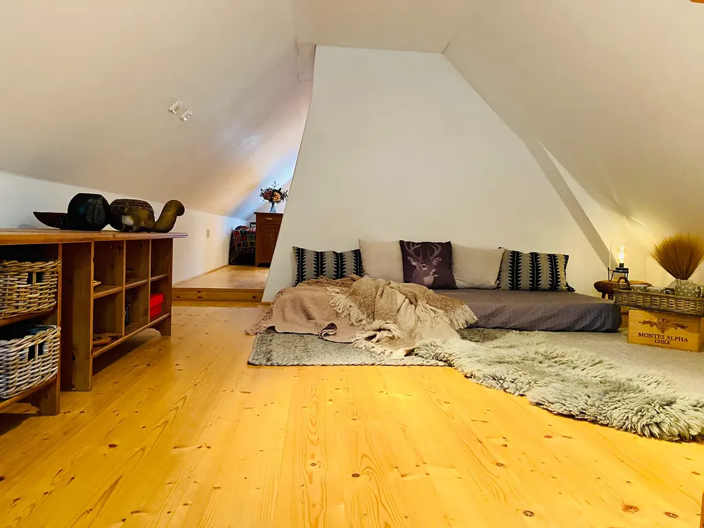 Podkroví nabízí dva romantické pokoje s výhledem do okolní zeleně, které poskytují klidné zázemí pro rodinu i hosty.