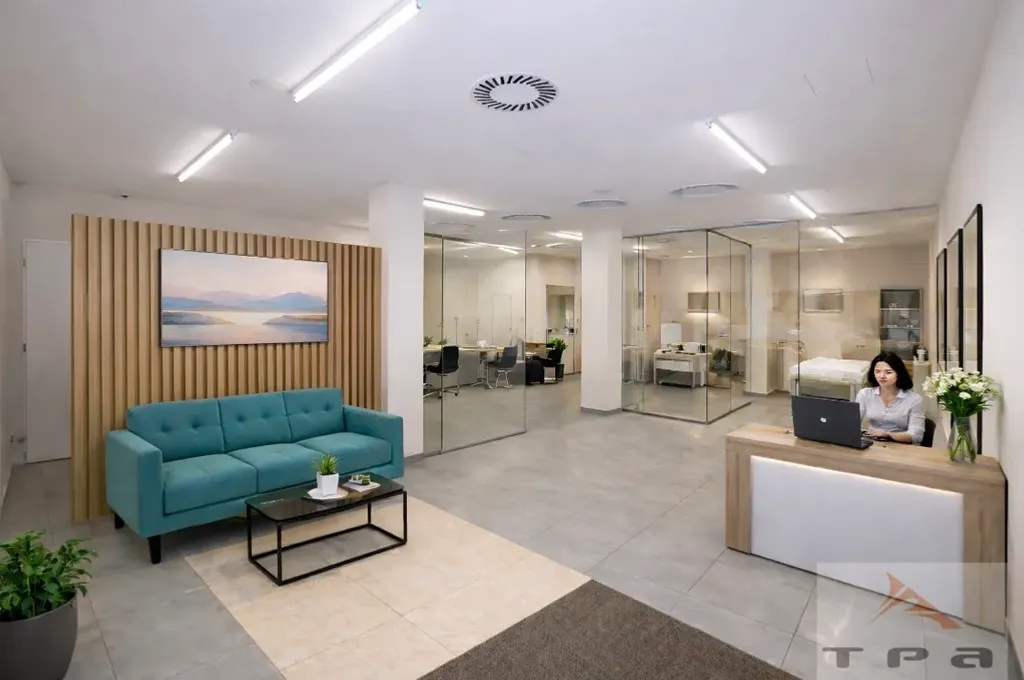 Obchodní prostor nabízí užitnou plochu 100 m², vlastni sociální zařízení, šatnu ,zavedena voda v 5 místech, ideální pro různé podnikatelské záměry, kanceláře, kadeřnictví, kosmetický salon , pedikúra manikúra , zubní ordinace , obchod s oblečením nebo jiné zaměření a nachází se na strategicky výhodné pozici v historickém lázeňském centru s dostupností autobusové dopravy. Moderní architektura a přírodní materiály dodávají prostoru elegantní vzhled a přívětivost, která jistě zaujme Vaše klienty.