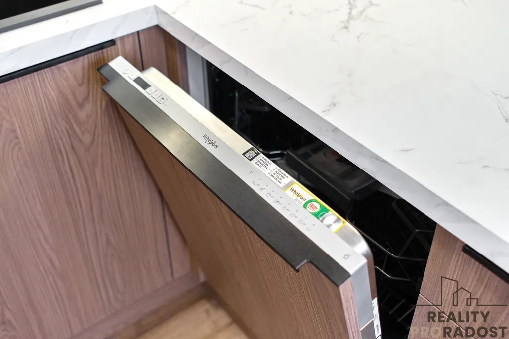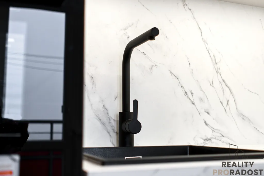 Kuchyňská linka vyrobená na míru kombinuje dekory kašmírově šedé a dubu Casella. Vestavěné spotřebiče v kontrastní černé barvě (lednice s mrazákem, trouba, mikrovlnná trouba, indukční deska, odsavač par s uhlíkovým filtrem a myčka) jsou značky Whirpool, granitový dřez Franke. Kombinuje se zde systém otevírání pomocí úchytek a tip on systému, kovaní je použito od značky Blum. Pod horními skříňkami je LED osvětlení. Kuchyňská linka do tvaru L nabízí velké množství úložného a pracovního prostoru.