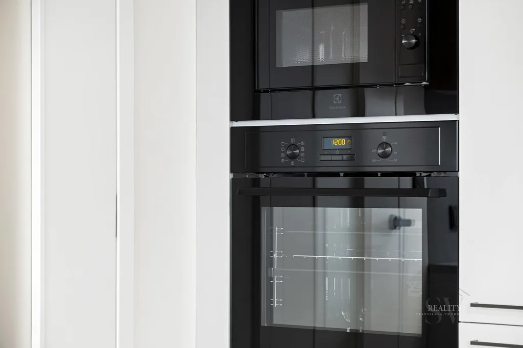 Kuchyň je vybavena špičkovými spotřebiči Electrolux (indukční deska, trouba, mikrovlnná trouba, myčka, vestavná lednice s mrazákem) a luxusním dřezem a baterií Blanco.