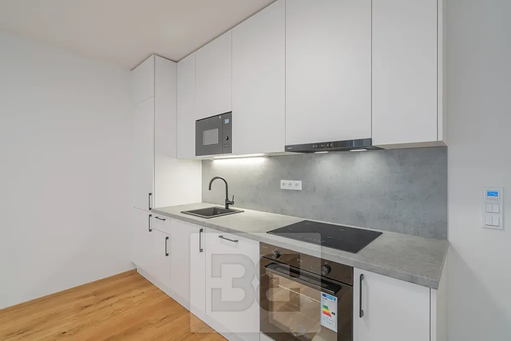 Součástí bytu je moderní kuchyňská linka vybavená spotřebiči (myčkou nádobí, lednicí, digestoří, mikrovlnnou troubou a pečicí troubou). V celé místnosti jsou položeny krásné dřevěné podlahy, které podtrhují celkově kvalitní charakter interiéru. Velká okna s designovými závěsy zajišťují dostatek denního světla a příjemnou atmosféru.