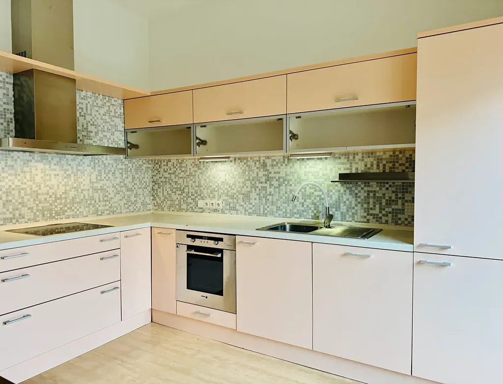 Z předsíně se vstupuje do prostorné kuchyně, je zde umístěný rozkládací stůl a nábytková stěna na míru jako úložný prostor. Z kuchyně je vstup na prostornou terasu orientovanou do klidového vnitrobloku.