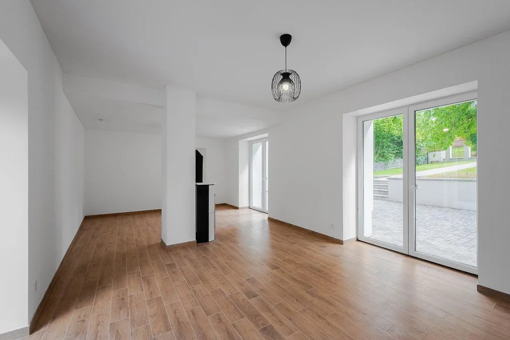 Prostorný a světlý obývací pokoj s francouzskými okny a přímým vstupem na obě terasy