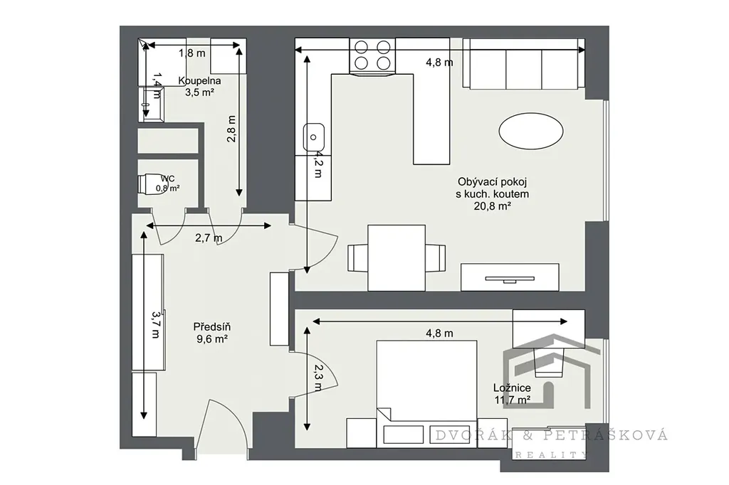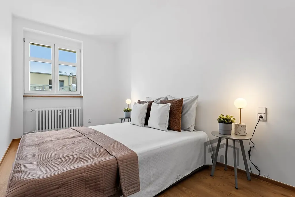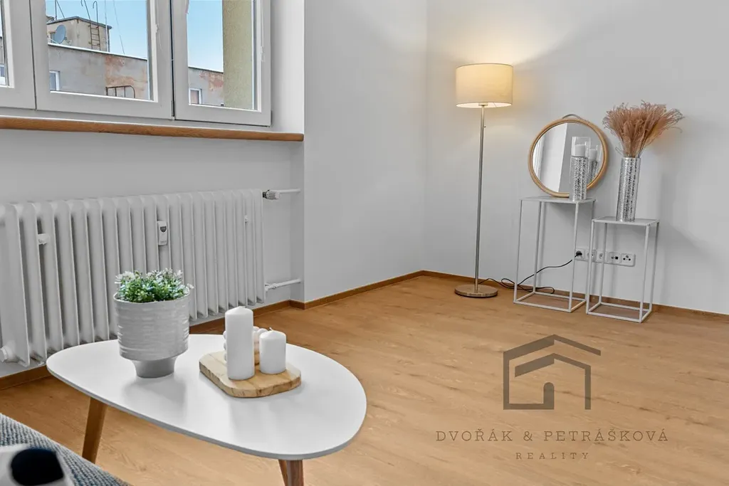 Nově zrekonstruovaný byt s podlahovou plochou 45 m2 se nachází ve 4.patře cihlového domu s výtahem. Byt prošel nákladnou rekonstrukcí a je vhodný pro jednotlivce nebo pár. Bytová jednotka disponuje prostornou vstupní chodbou s dostatkem místa na šatní skříně a oddělenými vstupy do jednotlivých pokojů. Obývací pokoj s kuchyňským koutem je vybavený vestavnou lednicí s mrazákem, myčkou, horkovzdušnou troubou, indukční varnou deskou, digestoří a dostatkem úložného prostoru. Ložnice s výměrou 12 m2 a přístupem z chodby, koupelna se sprchovým koutem a připojením na pračku, toaleta je oddělená. Použitý nábytek je pouze ilustrační a není součástí pronájmu ani jej nelze ponechat. Byt prošel kompletní rekonstrukcí, na podlahu byla položená vinylová podlaha a byt je kompletně bez prahový, v pokojích jsou umístěna plastová okna s žaluziemi. Ohřev vody a teplo dálkově z teplárny. Byt je volný k nastěhování. K bytu náleží sklepní kóje. V domě je výtah, který jezdí na patro bytu. Parkování je možné před domem, na modrých zónách.