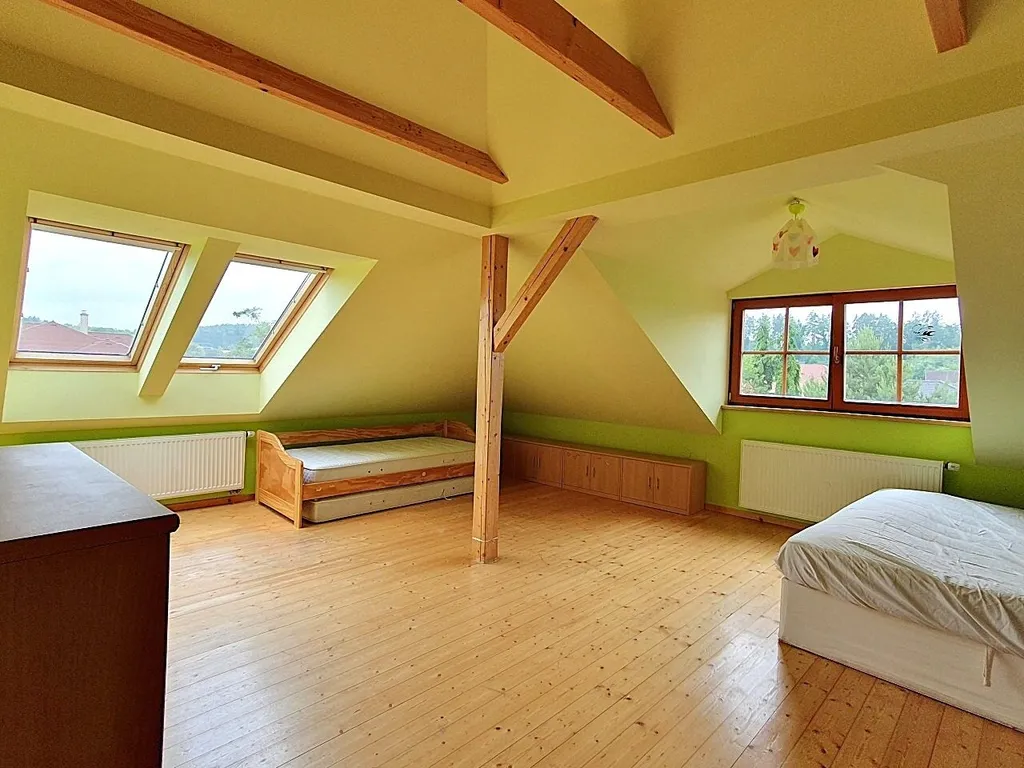 Dům je částečně zařízený nábytkem - jedná se převážně o úložné prostory, stoly a cca 3 postele. Kuchyňská linka zn. Sýkora je vybavena novou indukční varnou deskou, el. troubou, digestoří, myčkou a malou lednicí. V domě byly použity jen kvalitní a drahé materiály - dubové dřevěné podlahy, keramická dlažba, obklady v hlavní koupelně od firmy Villeroy & Boch, skříně, dveře, zárubně a schody jsou výhradně jen z masivu, kvalitní dřevěná eurookna TWW, funkční kachlová kamna v kuchyni z Kamnářství Jan Janoušek, nové osvětlení v obývacím pokoji a kuchyni, nejtišší tepelné čerpadlo na trhu Acond Pro R, centrální vysavač Electrolux, elektronický zabezpečovací systém Rokonet Orbit-Pro apod. Na pozemku je vlastní studna vhodná k zalévání zahrady a závlaha Hunter Pro - C. Kanalizace je obecní. Parkování je možné v prostorné garáži i na pozemku za bránou, která je kovaná, s el. pohony a na dálkové ovládání.
