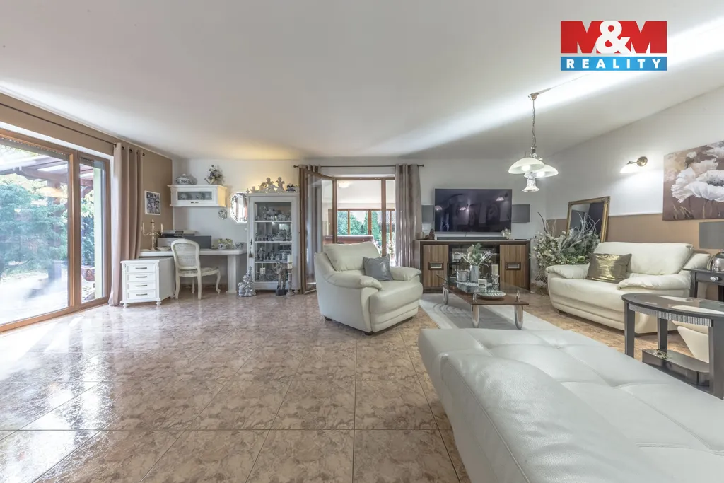 Pozemek 1 494 m² garantuje soukromí, tři terasy vytvářejí různé atmosféry dne, garáž pro tři vozy a kryté stání pro další dvě auta splní i náročné představy o komfortu.