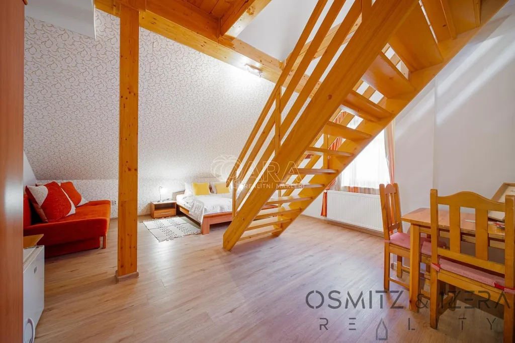 Luxusní zázemí pro majitele: Nadstandardní apartmán 4+kk s krbem, zimní zahradou a terasou. Tento prostor je také možné přebudovat na další apartmány.