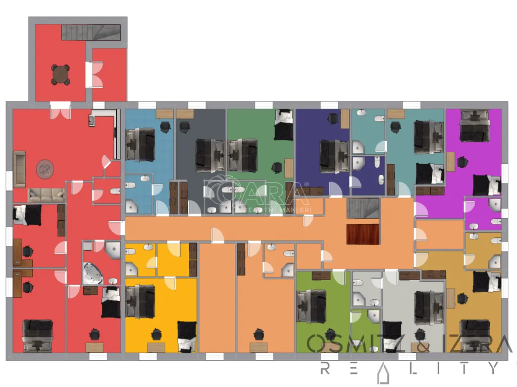 Ubytování: 12 unikátních pokojů (z toho 6 mezonetových) s celkem 46 lůžky. Každý pokoj má vlastní sociální zařízení. Část pokojů je možno předělat na apartmány.