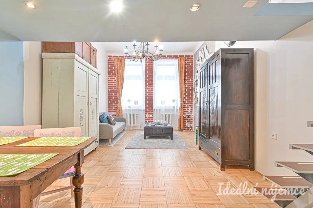 Byt se nabízí plně vybavený. Kuchyně elektrickou troubou, varnou deskou, lednicí, pračkou a digestoří. Obývací část disponuje pohovkou, šatními skříněmi, jídelním stolem se židlemi. Díky vysokým stropům je spací část vyřešena na patře. V koupelně je sprchový kout, toaleta a umyvadlo.