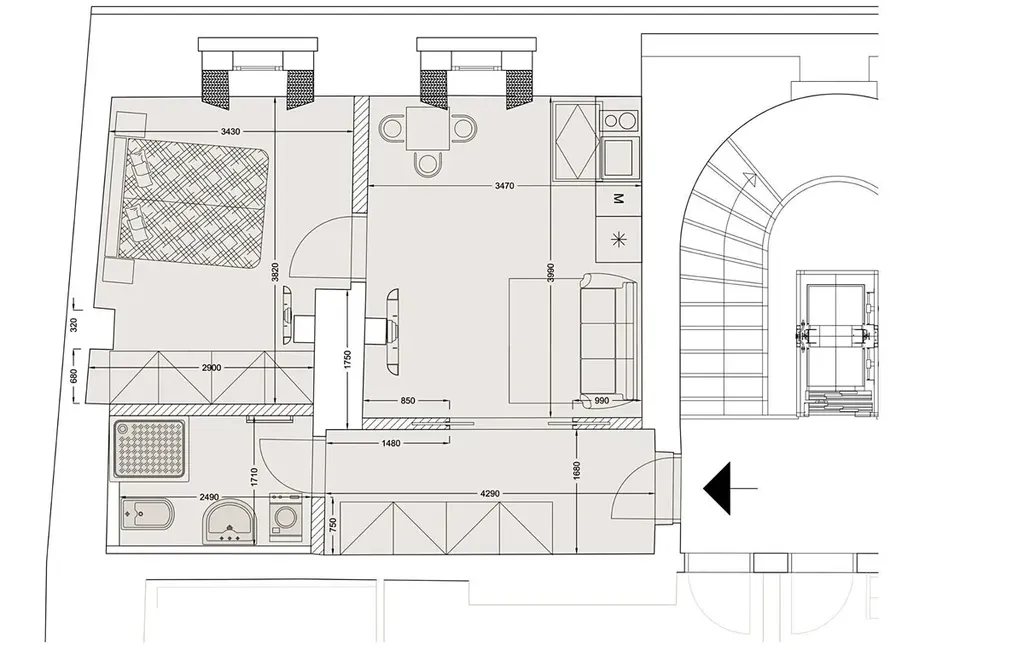 Designový mezonet 2+kk (1 ložnice, 1 koupelna), o celkové obytné ploše 40m2, je situován v 5. patře zrekonstruované rezidenční historické budovy s výtahem, v prestižní lokalitě Staré Město na Praze 1, nedaleko Staroměstského náměstí, v ulici Kozí.