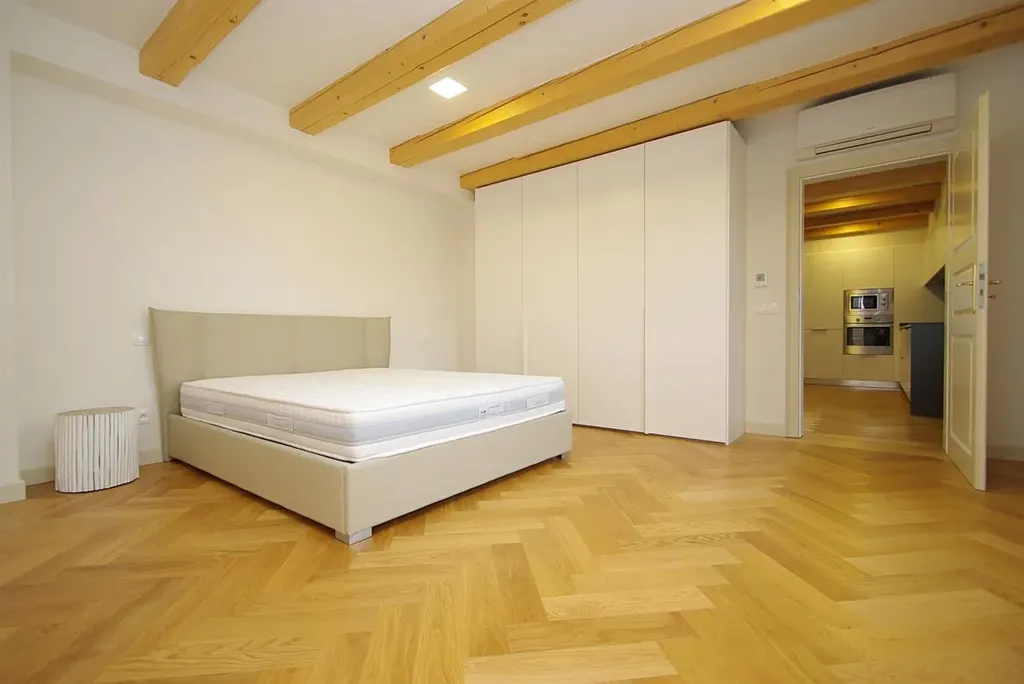 Prostorný klimatizovaný moderní byt 3+kk (2 ložnice, 3 koupelny), o celkové ploše 199 m2, je situovaný ve 4. patře zrekonstruované rezidenční budovy, která disponuje plně vybavenou posilovnou a je umístěna v atraktivní lokalitě Praha 1 Nové Město, v Bolzanově ulici.