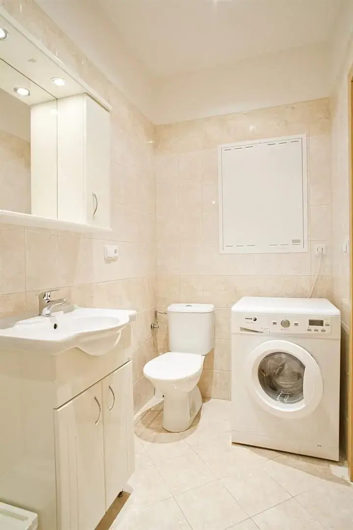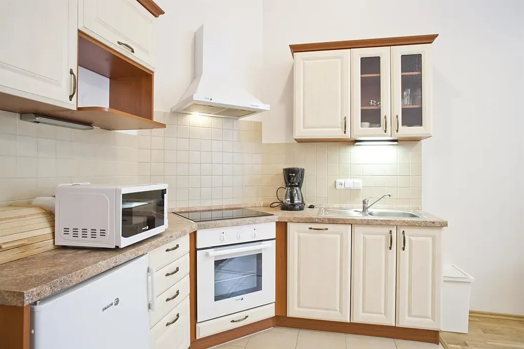 Byt je plně vybaven nábytkem a dispozičně nabízí vstupní chodbu, prostorný obývací pokoj s jídelním koutem a kuchyňskou linkou plně vybavenou vestavěnými spotřebiči (elektrická varná deska, trouba, lednice, myčka, mikrovlnná trouba), samostatnou ložnici, koupelnu s umyvadlem, sprchovým koutem, toaletou a pračkou.