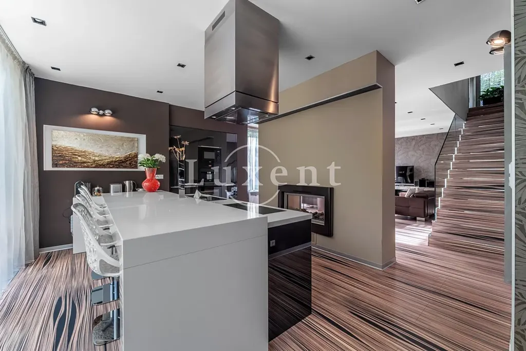 Kuchyně je vybavena špičkovými spotřebiči Miele: parní a horkovzdušnou troubou, indukční varnou deskou, mikrovlnou troubou, vestavěnou lednicí, kávovarem, vinotékou, ale také velmi praktickou ohřívací zásuvkou na jídelní servis.