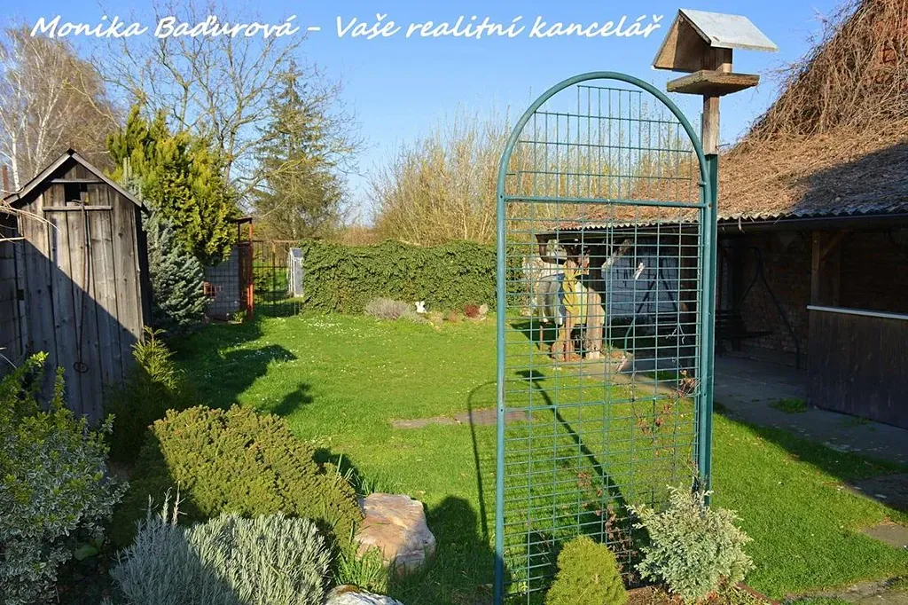 Na dům navazuje zpevněné nádvoří s okrasnými keřy, chráněné cihlovou zdí, která zajišťuje dostatek soukromí. U nádvoří se nachází hospodářské místnosti se spoustou úložného prostoru a kryté venkovní posezení, které je v létě krásně porostlé zelení. V zahradě jsou vzrostlé a plodící ovocné stromy (slivoně, špendlík, hrušeň, třešeň, jabloně, meruňky, ořechy) a skleník pro brzké pěstování vlastní zeleniny.