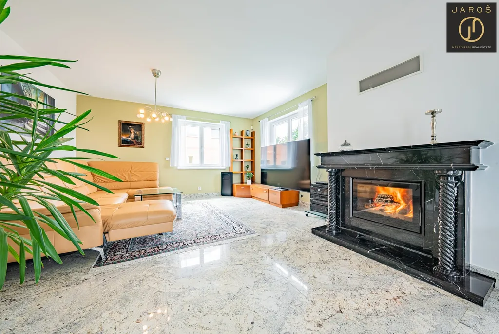 V přízemí najdete prostornou vstupní chodbu, kuchyni propojenou s jídelnou a obývacím pokojem, pracovnu a koupelnu se sprchovým koutem. Obývací část je vzdušná a příjemně propojená s exteriérem – nechybí krb a přímý vstup na terasu s markýzou, ideální pro posezení v soukromí zahrady.