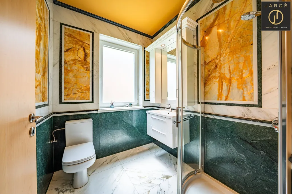 V patře se nachází hlavní ložnice s vlastní šatnou, dvě další ložnice, velká koupelna s vanou i sprchovým koutem a dva balkony – menší u koupelny (6 m²) a větší terasa (20 m²) přístupná z ložnice i dalšího pokoje. Z terasy se otevírá nádherný výhled na Karlovy Vary a okolní krajinu.