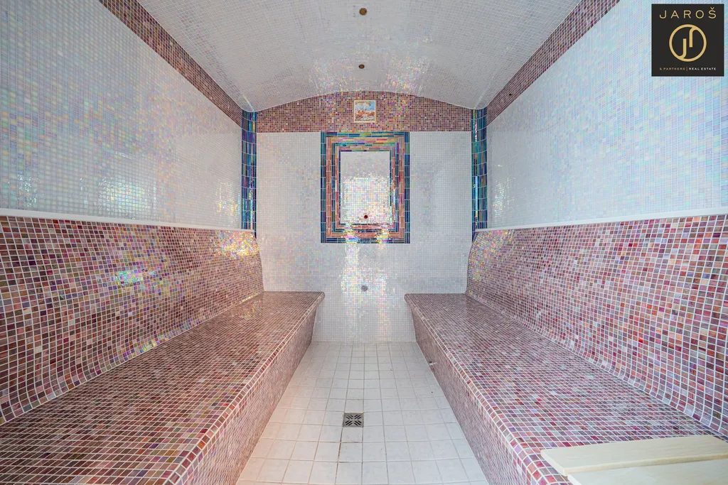Podzemní podlaží je plně využité pro relaxaci a zábavu. Najdete zde hernu s kulečníkem, stolním tenisem a šipkami, domácí fitko, parní saunu s odpočívárnou, sprchou a samostatnou toaletou, technické zázemí a skladovací místnost s regály. Praktickým detailem je i shoz na prádlo z horní koupelny přímo do sklepa.