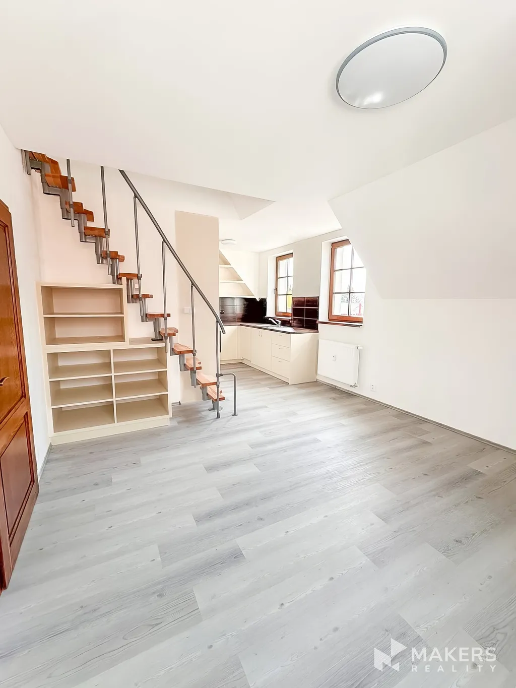 V prvním patře bytu se nachází prostorný obývací pokoj propojený s kuchyní a také koupelna se sprchovým koutem.