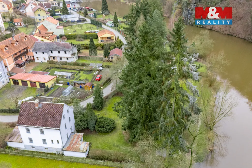 Součástí je také velkorysý pozemek, který poskytuje soukromí, prostor pro zahradu i možnost další výstavby. Na břehu řeky se navíc nachází rybářská chata, ideální místo pro relaxaci, posezení u vody nebo rybaření.