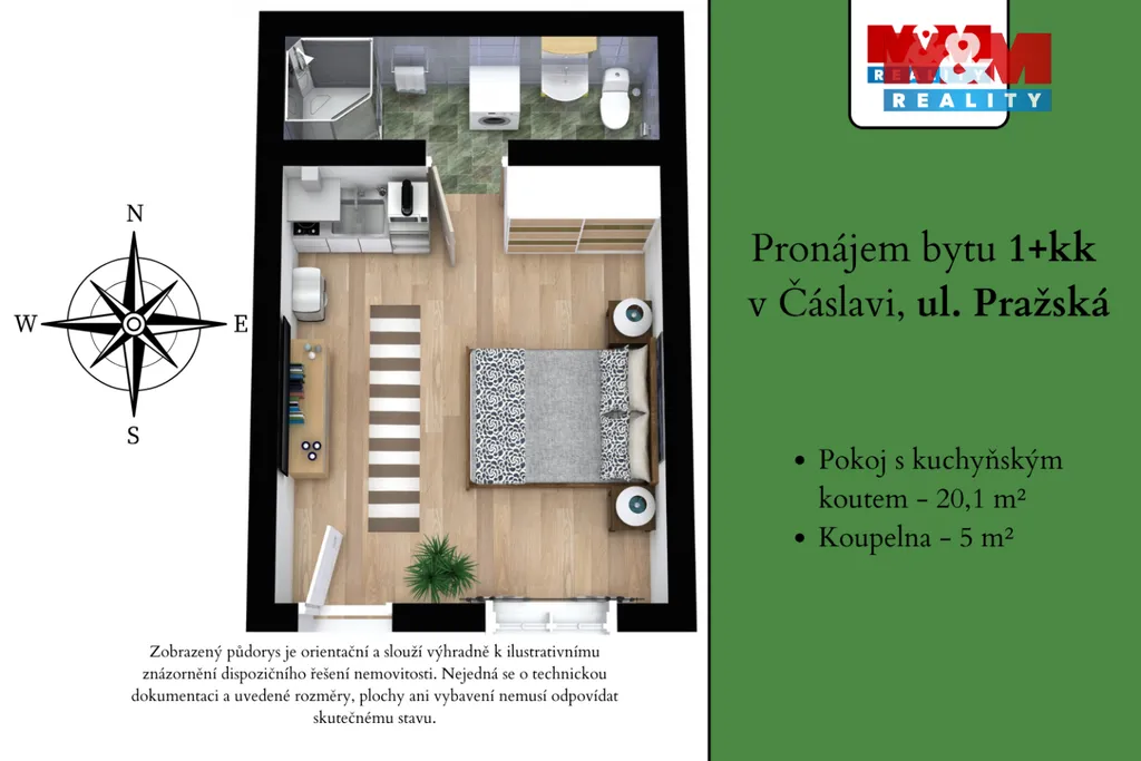 Nabízíme k dlouhodobému pronájmu světlý byt 1+kk o užitné ploše 25 m² v klidné části Čáslav ‑ Nové Město. Byt je ve velmi dobrém stavu a nabízí jednu prostornou místnost s kuchyňským koutem a vlastní koupelnu se sprchovým koutem, což představuje příjemné bydlení pro jednotlivce či pár. Jednotka je vybavená, tudíž nebrání nic okamžitému užívání. Díky své poloze máte na dosah obchody, restaurace i kulturní vyžití. Vynikající dopravní dostupnost zajišťuje blízkost veřejné dopravy. K nájemnému je třeba přičíst 4.000 Kč měsíčně na vodné - stočné, internet, elektřinu, vytápění a další služby. Kauce se skládá ve výši 10.000 Kč, odměna zprostředkovateli činí 12.100 Kč včetně DPH. Pokud Vás tato nabídka zaujala neváhejte se na nás obrátit a sjednat si prohlídku.