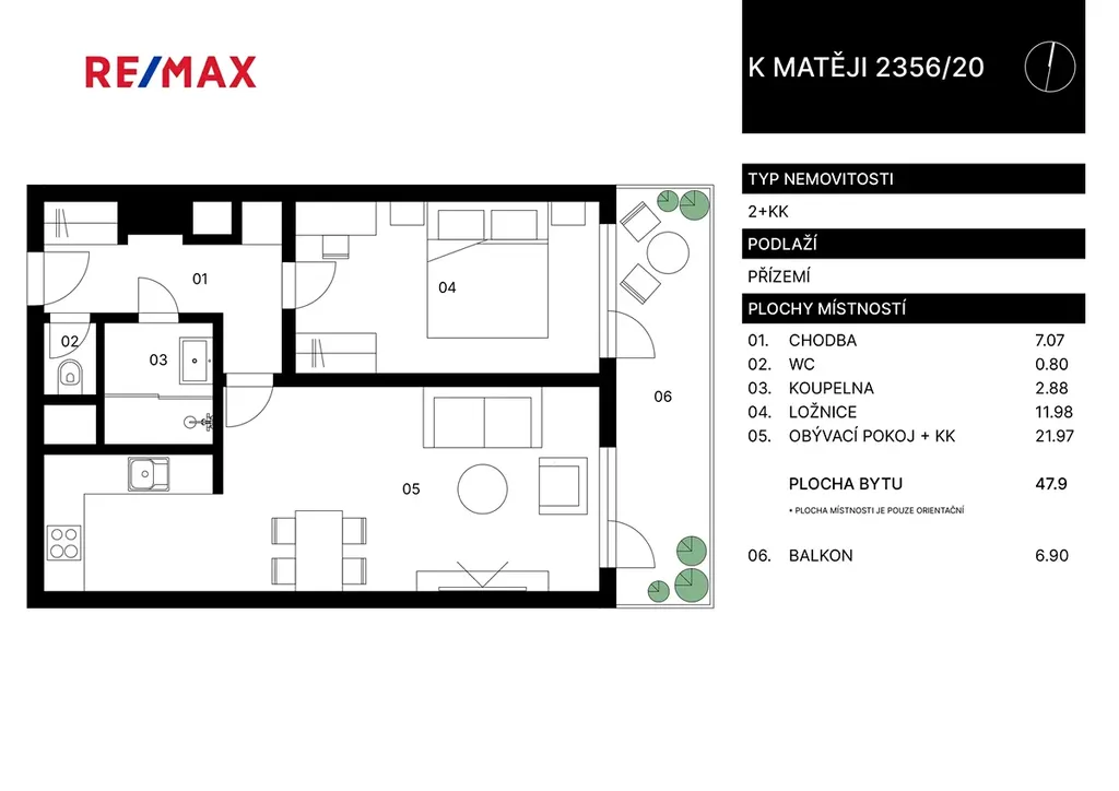 Byt v osobním vlastnictví má celkovou plochu 47,9 m² a nachází se v 1. nadzemním podlaží (1. NP). K bytu náleží prostorný balkon o velikosti 6,9 m², orientovaný do zeleně, který poskytuje příjemné místo k odpočinku.