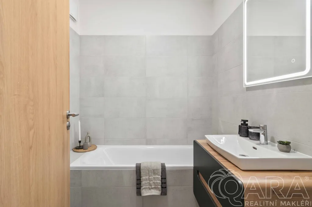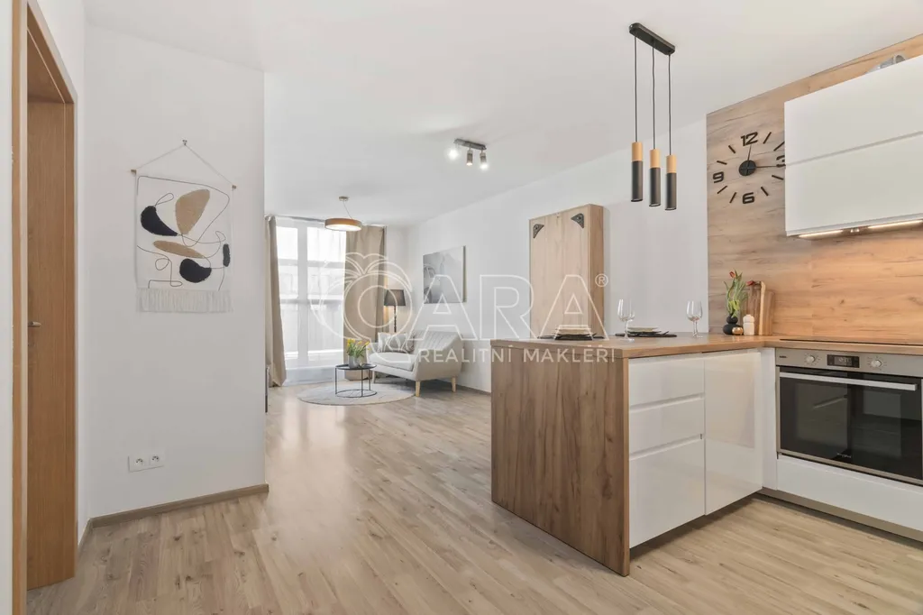 Dominantním prvkem bytu je kuchyňská linka do tvaru U s ostrůvkem, která určuje ráz celého prostoru a navazuje přirozeně na obývací prostor. Byt definují přírodní materiály a světlé tóny, což společně s denním světlem vytváří pocit vzdušnosti a útulnosti. Dispozici doplňují samostatná ložnice, koupelna s vanou, šatna a vstupní chodba s vestavěnou skříní. Byt nabízí nadstandardní množství úložných prostor a je vhodný i pro pár s dítětem.