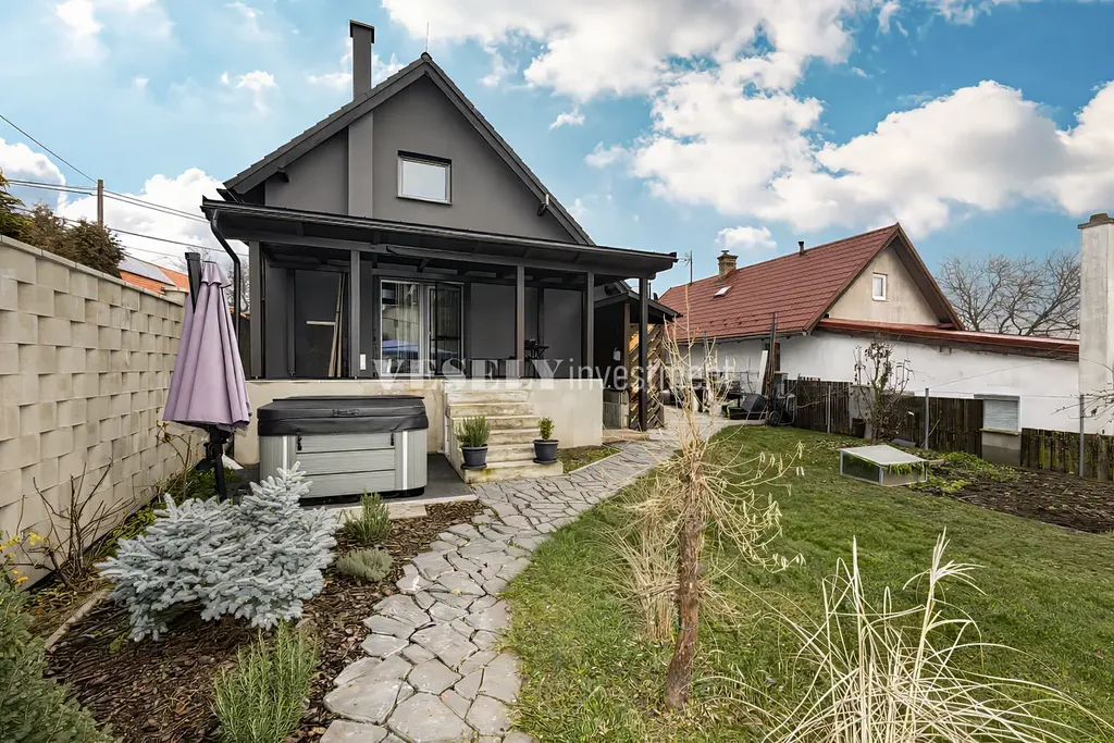 Zahrada má výměru 215 m² je upravená, udržovaná a nabízí dostatek soukromí. Nachází se zde pergola s posezením, ideální pro letní stolování, relaxaci nebo rodinná setkání. Za bránou na el. pohon lze pohodlně zaparkovat dvě auta.