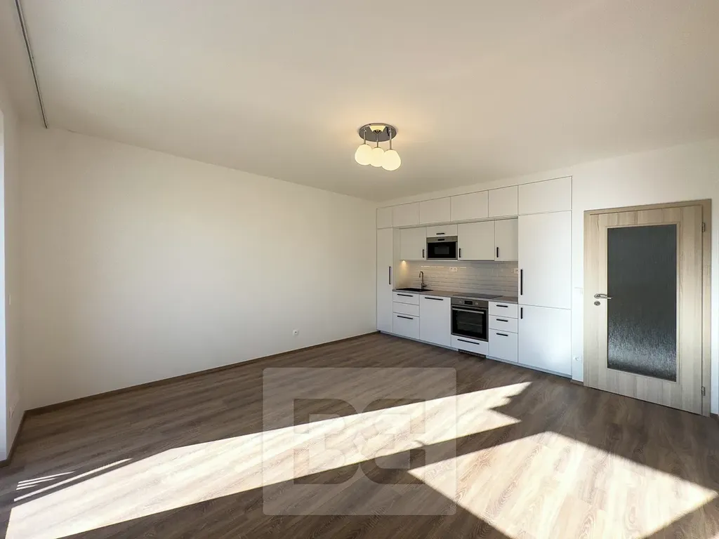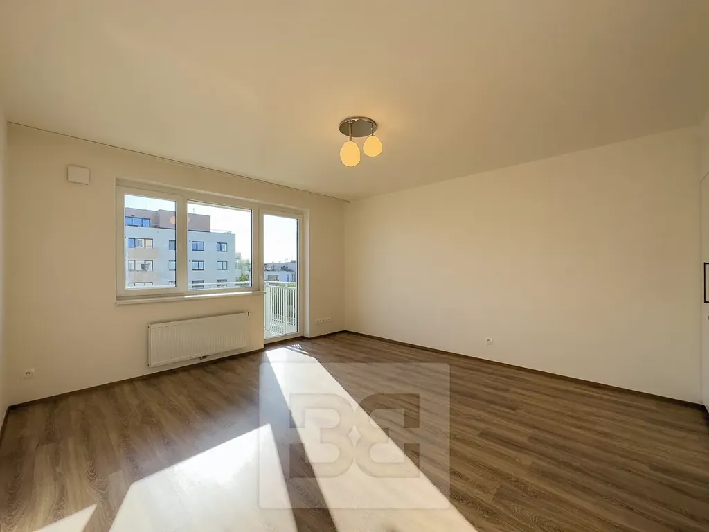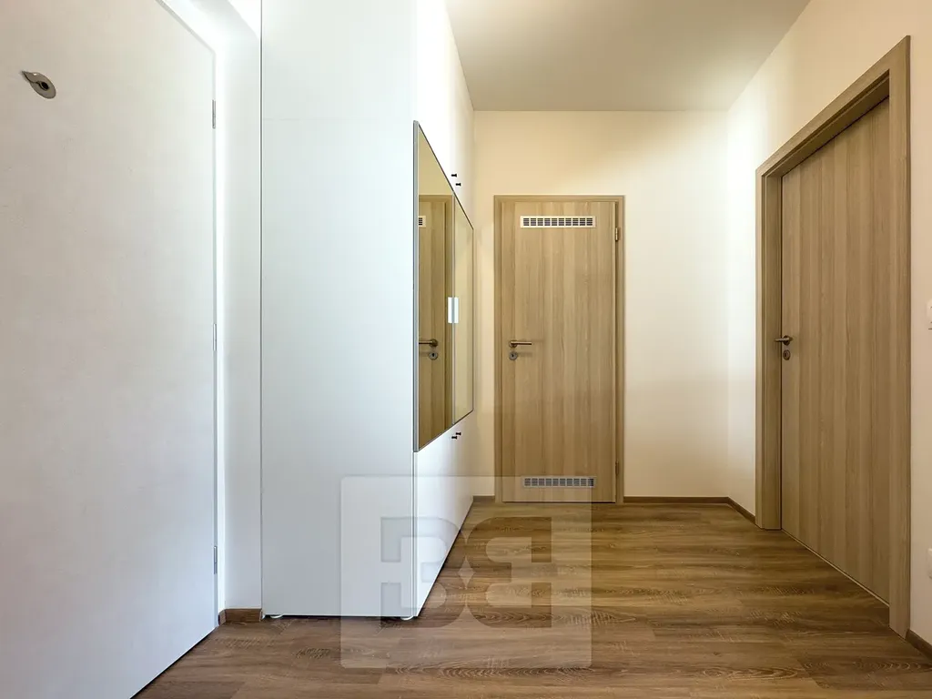 Byt je zcela nový a ještě nebyl obydlen. Byt se skládá z předsíně, koupelny s vanou a WC, obývacího pokoje s kuchyňským koutem, ložnice, šatny (komory) a balkonu. Kuchyň je vybavena kuchyňskou linkou s vestavěnými spotřebiči (pečící troubou, mikrovlnkou, varnou deskou, myčkou nádobí, digestoří a vestavnou chladničkou). Součástí bytu jsou šatní skříně v předsíni a ložnici. Koupena je vybavena pračkou. K bytu patří parkovací stání a sklep (v ceně nájmu). Obyvatelům domu je k dispozici velká kolárna s myčkou na kola.