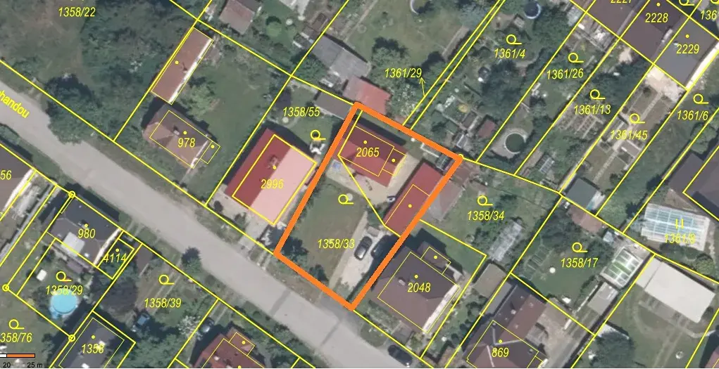 Celková plocha pozemku je 593 m2, z toho zastavěná plocha 258 m2 a zahrada 335 m2. Pozemek je rovinatý, zatravněný s keři a stromy, v zadní části je skleník.